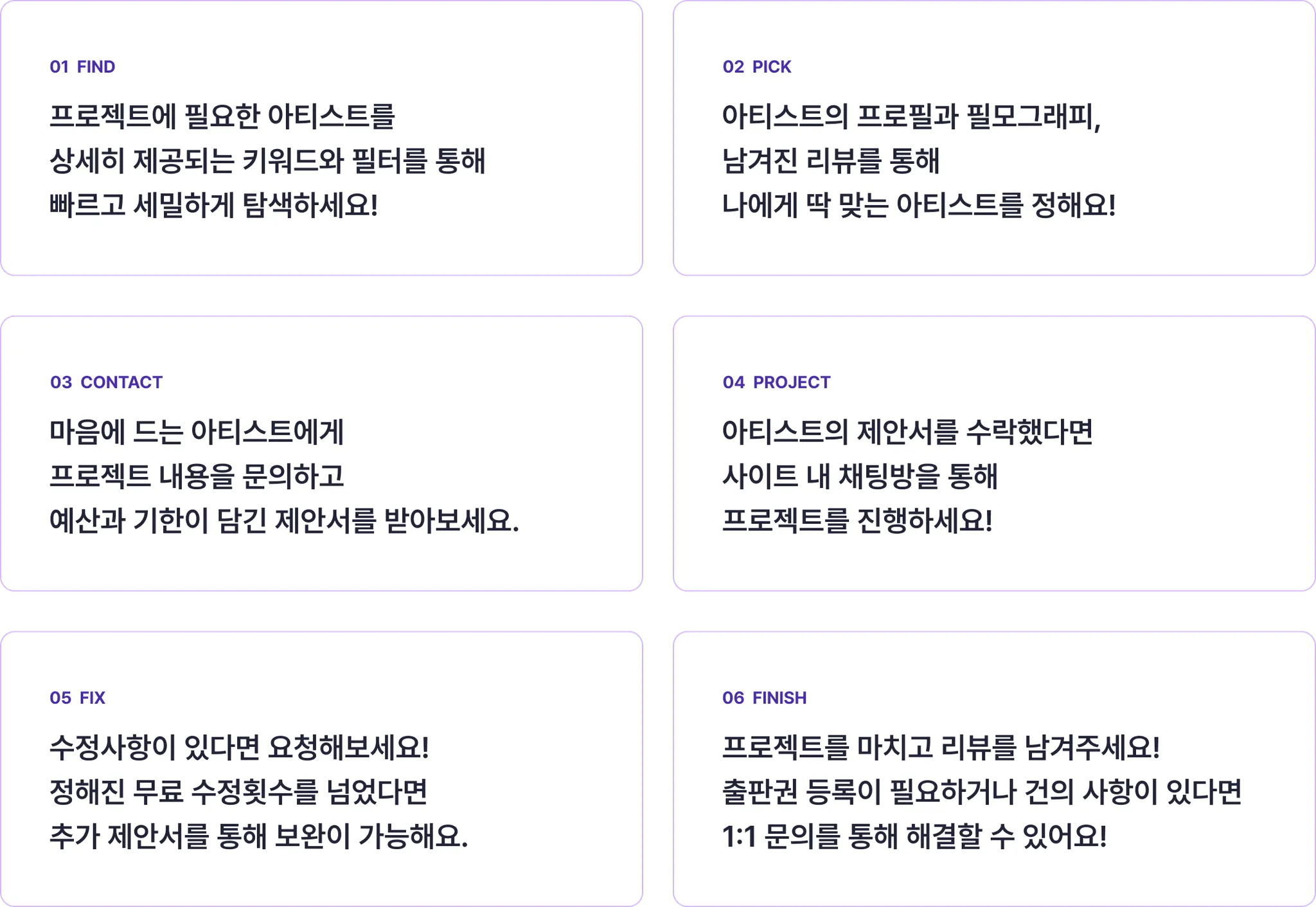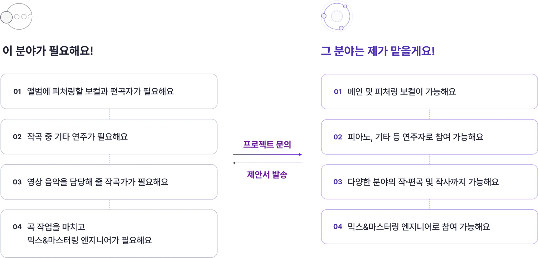 상세한 아티스트 인터뷰와 참여 곡에 대한 상세 정보, 전문 분야 별 평균 단가, 작업 기간 등을 체크한 뒤 문의하고 싶은 아티스트를 정해보세요!